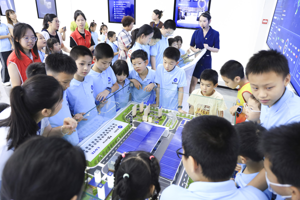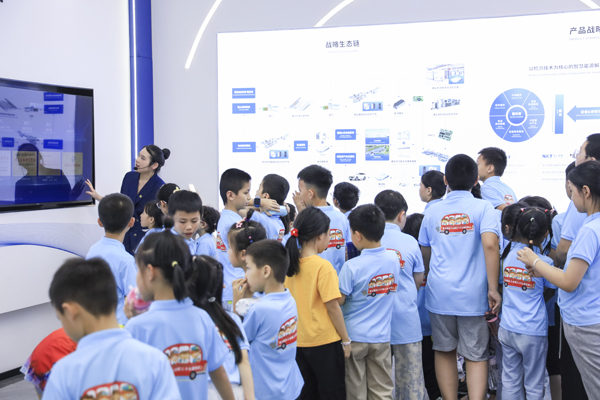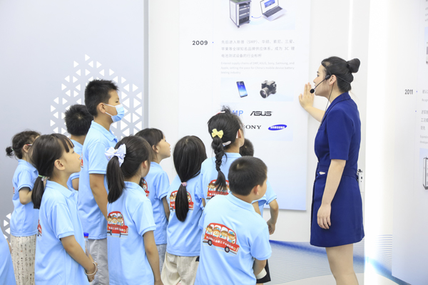 講解員和志愿者帶領(lǐng)孩子們參觀企業(yè)展廳