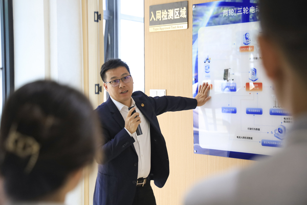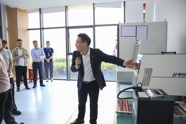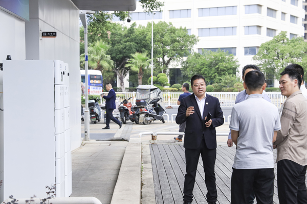 星云股份副董事長兼總裁劉作斌帶領(lǐng)客戶嘉賓參觀、體驗(yàn)電動(dòng)自行車、電動(dòng)摩托車電池檢測