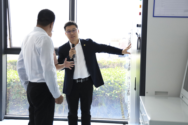星云股份副董事長兼總裁劉作斌帶領(lǐng)客戶嘉賓參觀、體驗(yàn)電動(dòng)自行車、電動(dòng)摩托車電池檢測
